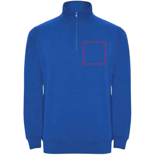 Sweat-shirt avec demi-fermeture zippée assortie et col polo. Col intérieur assorti. Coutures recouvertes renforcées à l'intérieur du col. Poignets et taille côtelés 1x1. Le mannequin mesure 185 cm et porte la taille M.