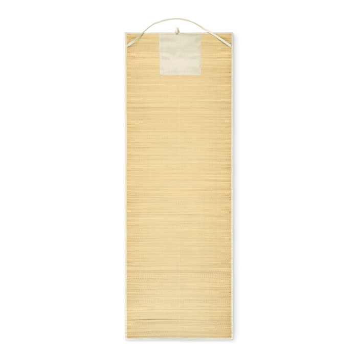 Natte de plage en paille naturelle enroulable avec sangle de transport en polyester.