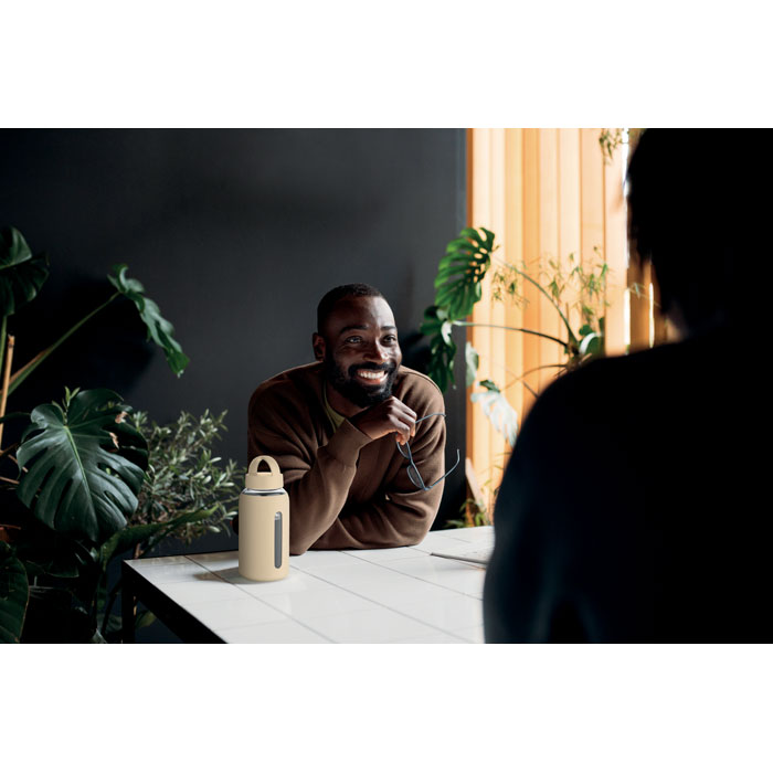 Bouteille en verre borosilicate de haute qualité avec pochette en silicone et couvercle en PP avec poignée. Capacité : 600 ml