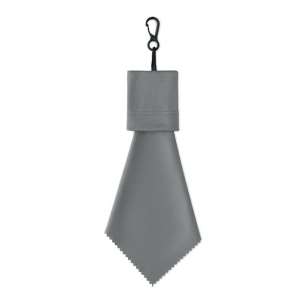 Lingette en RPET cousue à la pochette en matière assortie et crochet de suspension en plastique PP.