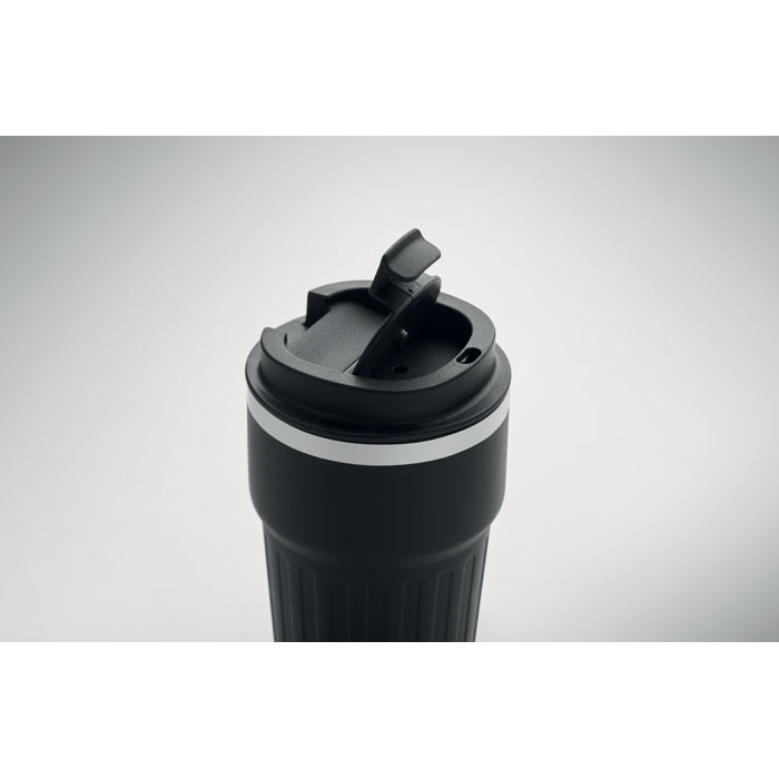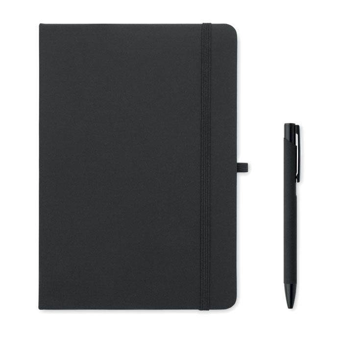 Carnet A5, stylo-bille en aluminium recyclé et gobelet double paroi en acier inoxydable recyclé de 350 ml avec couvercle à glissière en PP et sangle dans une boîte cadeau.