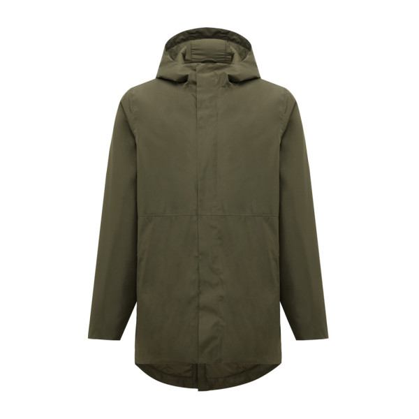 Parka imperméable matelassée unisexe, fabriqué à partir de polyester 100 % recyclé. La veste offre une imperméabilité de 4 000 mm, tout en étant respirante et résistante au vent. Elle reprend toutes les caractéristiques d’un parka classique : dos plus long, fente arrière, fermeture à glissière centrale réversible à double sens, recouverte d’une patte avant supplémentaire avec quatre boutons-pression cachés, poignets épurés avec demi-poignet intérieur. Le rembourrage est constitué de feuilles polyester 100% recyclé et la doublure est en taffetas fin. À l’arrière du col se trouve une étiquette de taille détachable, une étiquette iqoniq craft, ainsi qu’une étiquette d’entretien. L'utilisation de véritables tissus recyclés et les allégations relatives à l'impact environnemental sont garanties par l'utilisation du traceur physique disruptif AWARE™ et de la technologie blockchain. En scannant le code QR, vous aurez accès à un passeport numérique dédié.