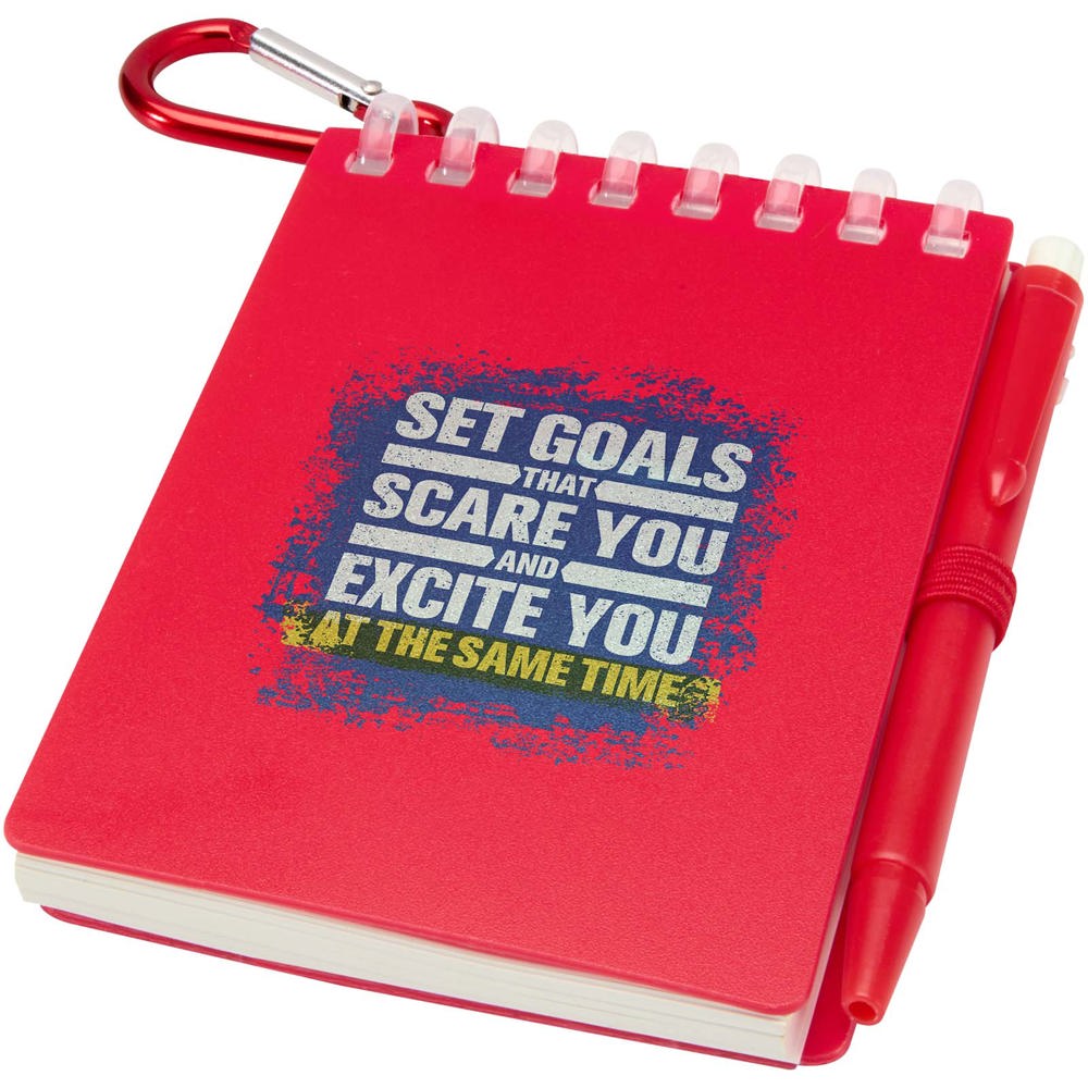 Le kit Lig composé d’un mini carnet et d’un stylo est un compagnon compact et pratique pour la prise de notes en déplacement. Le carnet à spirales est doté d’une couverture en plastique recyclé souple et de 70 feuilles vierges en papier de pierre résistant à l’eau de 120 g/m², ce qui le rend idéal pour une utilisation en extérieur. Avec ses coins arrondis et sa boucle pour stylo intégrée, il s’inscrit dans la tendance des mini cahiers tout en restant fonctionnel. Le stylo à bille assorti est fabriqué en plastique ABS recyclé, utilise de l’encre noire et offre une longueur d’écriture de 250 mètres. Un anneau métallique de couleur assortie permet d’attacher facilement le kit à un sac à dos, un sac à main ou un porte-clés, ce qui le rend idéal pour des prises de notes partout et en tous temps. Taille du carnet : 11 x 7,5 cm.