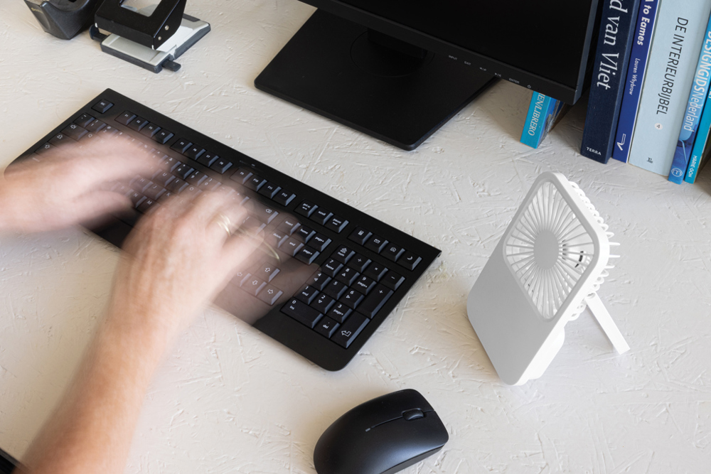 Le ventilateur de bureau Aervina, fabriqué à partir de plastique recyclé certifié RCS, est un moyen élégant et pratique de profiter d'une brise rafraîchissante à la maison ou au bureau. Son design moderne allie style et fonctionnalité. La batterie Li-ion rechargeable de 1200 mAh offre jusqu'à 3 heures d'autonomie et se recharge en 4 heures via le câble USB-A vers USB-C en TPE noir de 120 cm inclus. Avec trois niveaux de vitesse réglables et un support ajustable, le ventilateur Aervina offre un confort flexible partout où vous en avez besoin. Fabriqué à partir de plastique ABS recyclé certifié RCS. La norme RCS (Recycled Claim Standard) permet de vérifier la teneur en matériaux recyclés d'un produit tout au long de la chaîne d'approvisionnement. Teneur totale en matériaux recyclés : 58 % du poids total de l'article. Ce ventilateur est sans PVC et emballé dans une boîte en kraft certifiée FSC®. Puissance max. : 5 W | Courant d'entrée : 5 V / 400 mA.