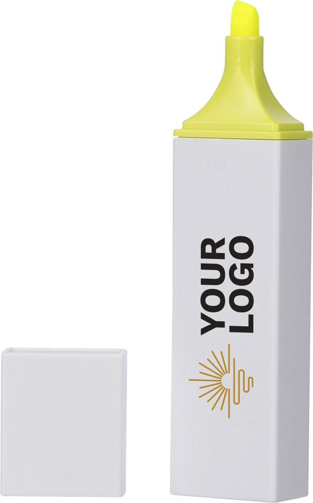 Surligneur en ABS recyclé, corps blanc et attributs colorés. Fermeture à clic et garantie 2 ans...plus