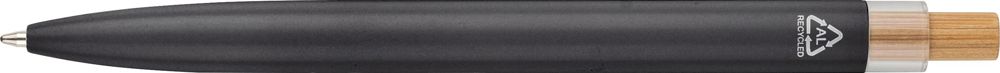 Coffret de stylos en aluminium recyclé laqué, composé d'un stylo-bille avec poussoir en bambou, attributs en rPET et clip en métal, et d'un stylo roller avec capuchon orné de détails en bambou et rPET et clip en métal assorti. Les deux stylos arborent un logo recyclé gravé. Longueur d'écriture approximative de 700 mètres pour le stylo-bille et 500 mètres pour le roller. La parure est présentée dans un coffret cadeau en carton recyclé. Encre bleue.