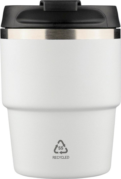 Mug double paroi de 175 ml en acier inoxydable recyclé avec intérieur en acier inoxydable 304 et extérieur en acier inoxydable 201. Finition thermolaquée et couvercle à vis en PP. Compact, il s'adapte à la plupart des machines à café. Logo recyclé gravé au laser sur le devant. Emballé individuellement dans une boîte cadeau en kraft.