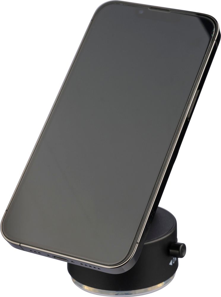Support de téléphone magnétique MagSafe en ABS recyclé, avec base à ventouse et système de verrouillage pour une fixation sûre. Pliable et compact, il est doté d'un anneau métallique pour une compatibilité avec tous les types de téléphones. Logo recyclé positionné entre le support et le support. Idéal pour une utilisation sur surfaces lisses, comme en voiture. Emballé individuellement dans une boîte cadeau en kraft.