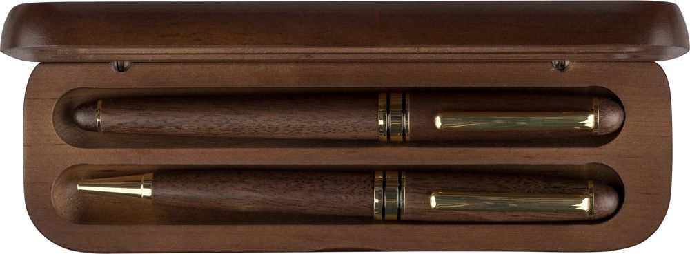 Coffret en bois de noyer et laiton, composé d'un stylo-bille à bille twist avec pointe, clip et attributs en métal, et d'un roller. Tous deux sont équipés d'encre allemande Dokumental bleue. Le stylo-bille a une écriture d'environ 1 000 mètres et le roller jusqu'à 400 mètres. Livrés dans un coffret en érable et une boîte cadeau en kraft. Encre bleue.