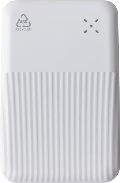 Power bank en ABS recyclé avec batterie Li-ion de 10 000 mAh et charge rapide de 22,5 W. Elle est équipée d'une entrée et d'une sortie Type-C, ainsi que d'une entrée Type-A. Son boîtier est conçu pour un tiers avec une surface lisse pour l'impression et pour les deux tiers avec un relief texturé. Son écran numérique supérieur affiche la capacité de la batterie. Elle offre une protection contre la surchauffe, les courts-circuits, les surtensions et les surintensités. Étiquette au dos avec le logo ABS recyclé. Emballée individuellement dans une boîte cadeau en kraft et papier de soie.