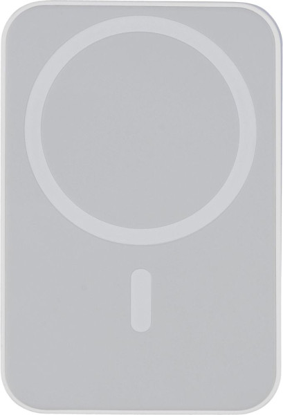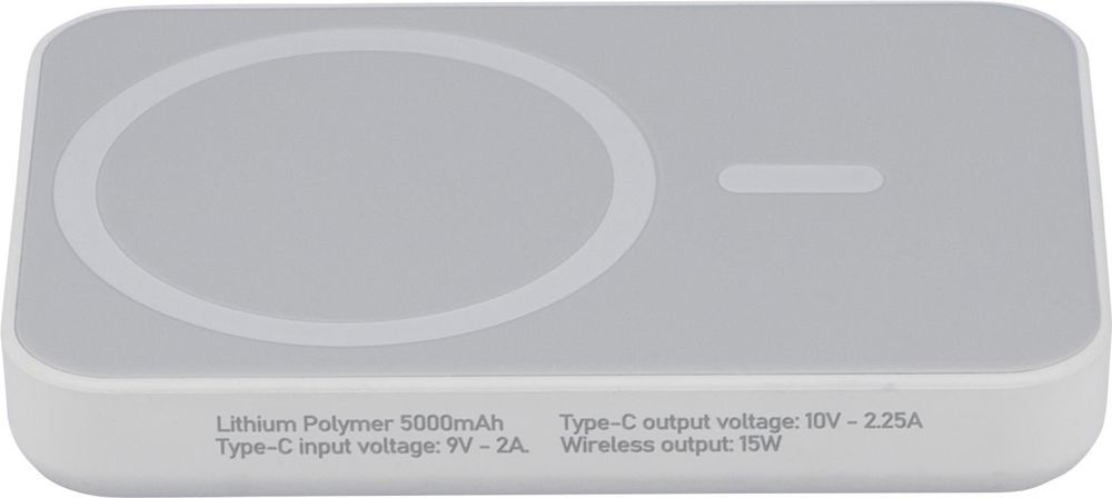 Power bank sans fil en ABS recyclé avec batterie Li-ion de 5 000 mAh et sortie de charge magnétique sans fil de 15 W (compatible MagSafe). Entrée Type-C jusqu'à 20 W et sortie Type-C : 5 V CC/3 A, 9 V CC/2,22 A, 12 V CC/1,67 A. Protection contre la surchauffe, les courts-circuits, les surtensions et les surintensités. Arrêt automatique en cas de surchauffe. Anneau métallique adhésif supplémentaire inclus pour la charge sans fil des appareils non MagSafe. Étiquette latérale avec logo ABS recyclé (RABS). Emballée individuellement dans une boîte cadeau en kraft et papier de soie.