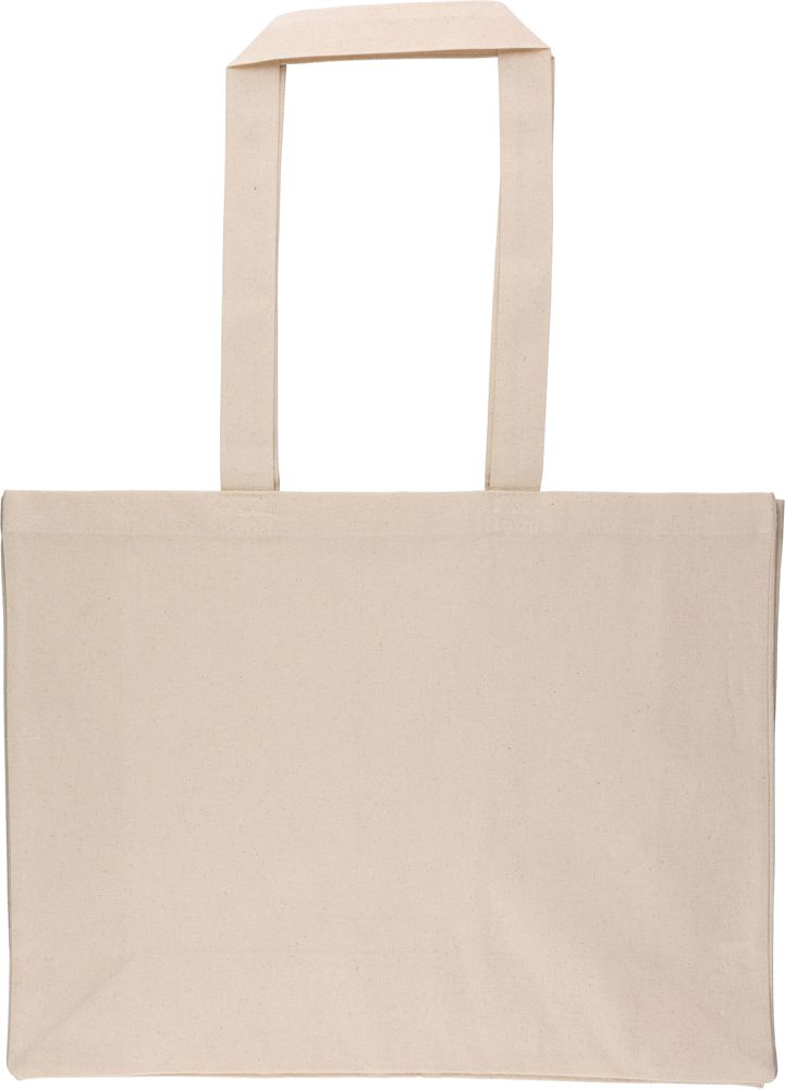 Sac shopping en coton 180 g/m² couleur naturelle avec soufflet. Dimensions : 43 × 34 × 13 cm, anses de 67 cm de long et de (3 cm de large. Ce produit est certifié OEKO-TEX® STANDARD 100.