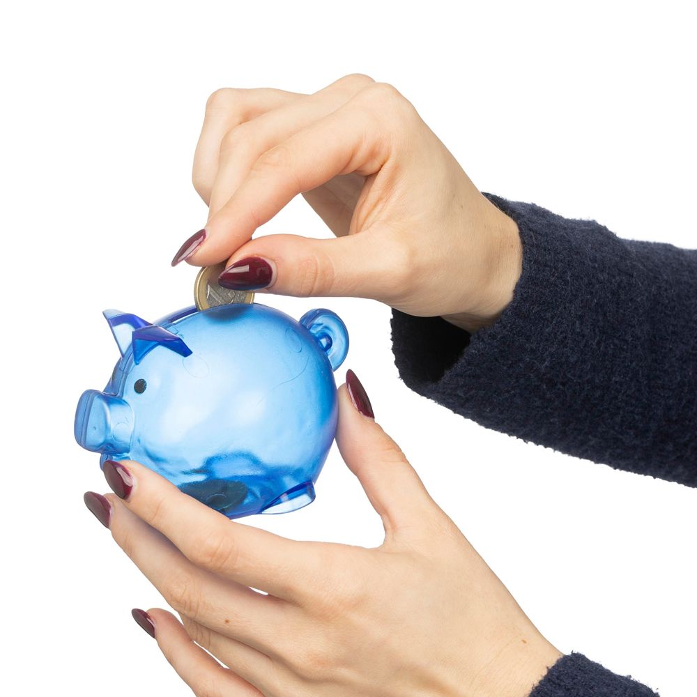 Tirelire cochon en plastique PS recyclé transparent avec logo recyclé au dos.plus
