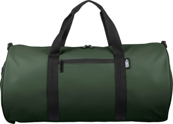 Sac de sport en rPET, fabriqué en polyester 600D avec doublure 210D et revêtement PU déperlant. Il comprend un grand compartiment principal zippé, une petite poche avant zippée pour vos effets personnels, une petite poche latérale zippée supplémentaire et une poche latérale en filet. Il est équipé de deux poignées de transport et d'une bandoulière réglable. Capacité : 40 litres. Étiquette rPET à l'extérieur.