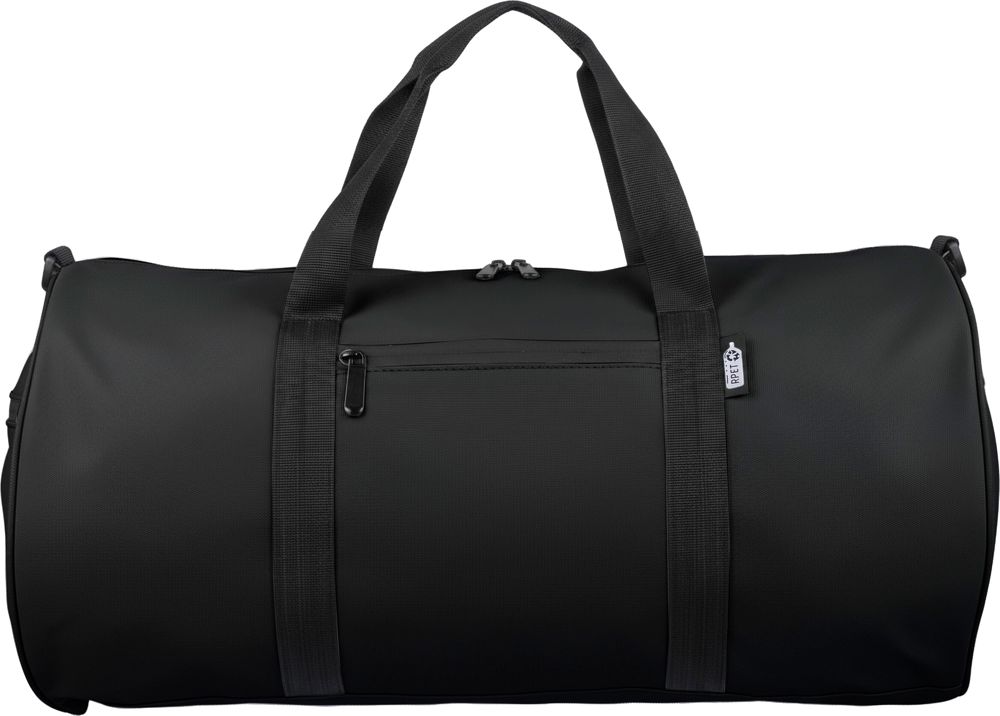 Sac de sport en rPET, fabriqué en polyester 600D avec doublure 210D et revêtement PU déperlant. Il comprend un grand compartiment principal zippé, une petite poche avant zippée pour vos effets personnels, une petite poche latérale zippée supplémentaire et une poche latérale en filet. Il est équipé de deux poignées de transport et d'une bandoulière réglable. Capacité : 40 litres. Étiquette rPET à l'extérieur.