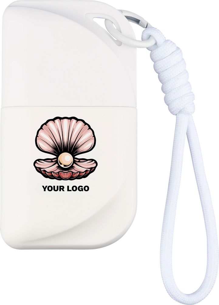 Tube en PP contenant 50 ml de crème solaire (SPF 50) muni d'un cordon en polyester de couleur assortie avec crochet métallique. Étiquette autocollante au dos.