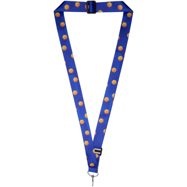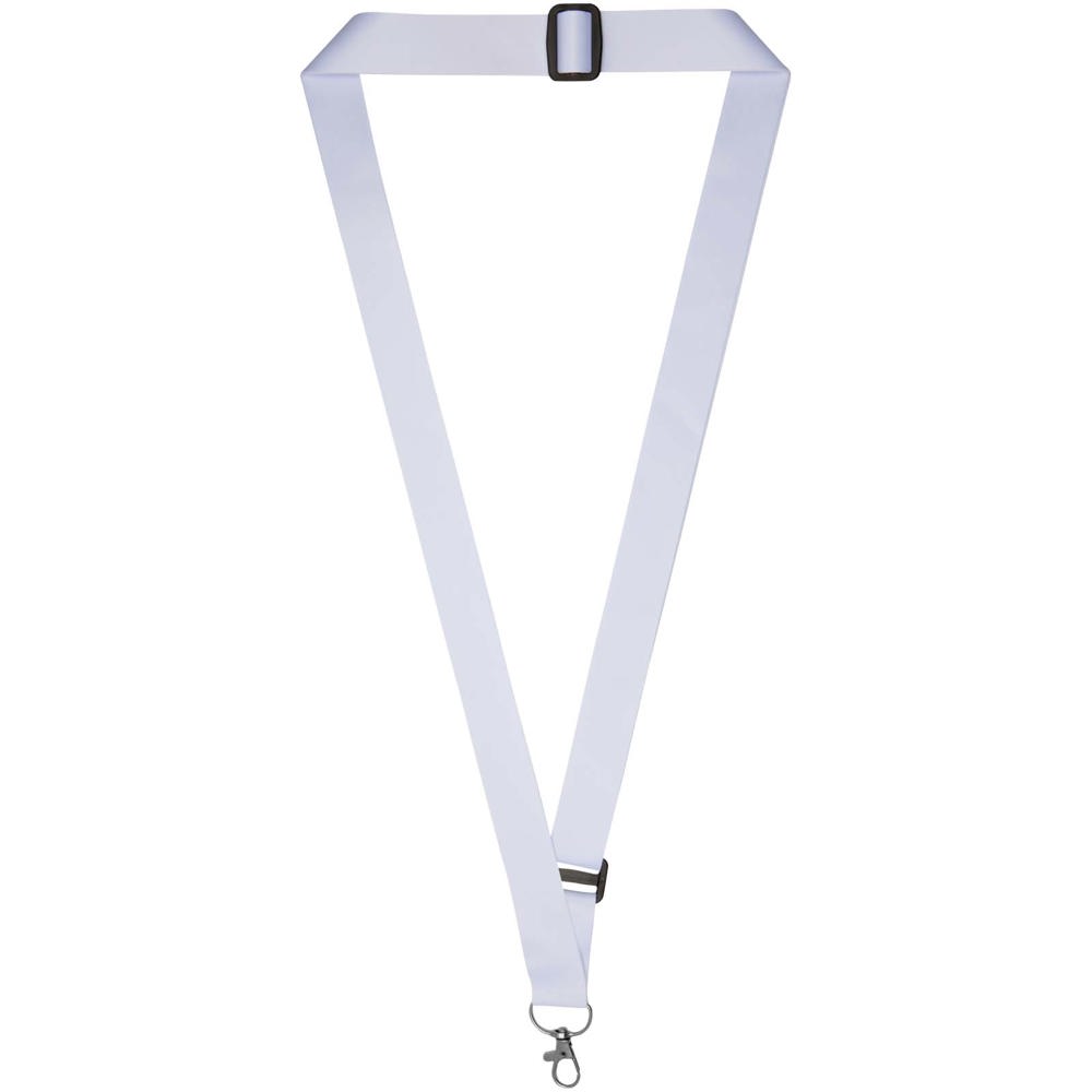 Tour de cou réglable doté d'une boucle coulissante pour changer facilement la longueur et d'un crochet en métal robuste pour maintenir en toute sécurité un badge nominatif, une carte d'identité ou des clés. Il peut être imprimé sur une ou deux faces, avec un choix d'impression recto verso standard ou ajustée (l'impression ajustée garantit que le motif s'aligne des deux côtés). Fabriqué en Europe.