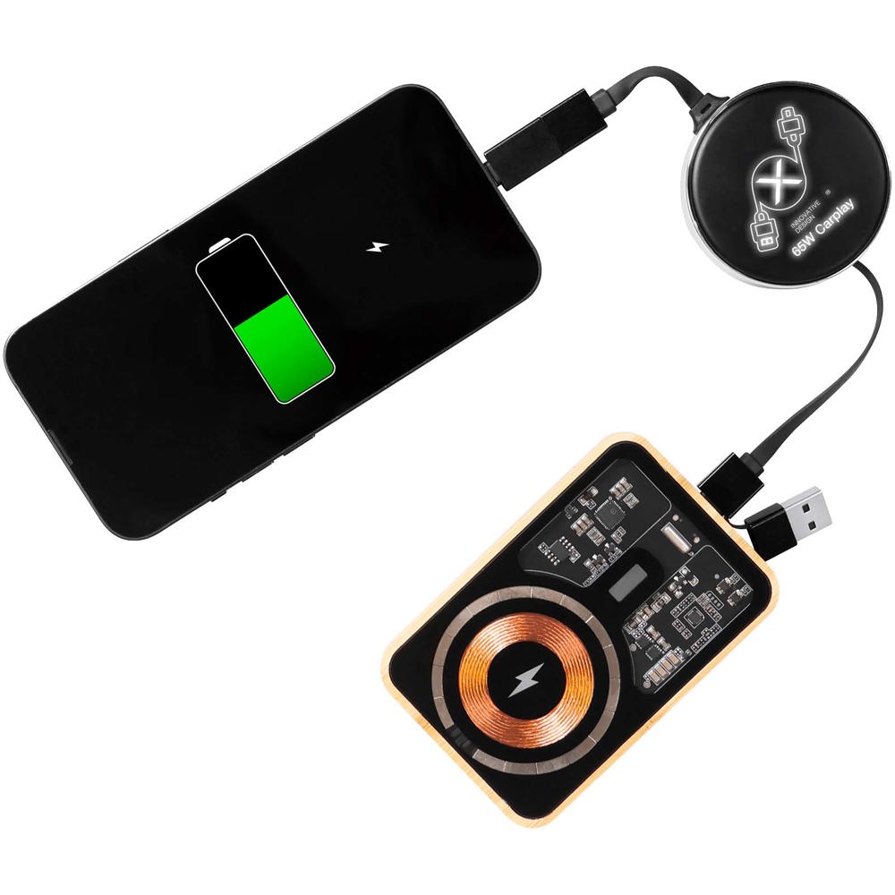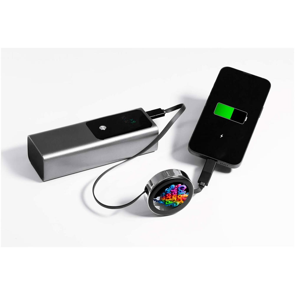 4-in-1 oprolbare 65W-oplaadkabel met dubbele USB-A + USB-C input en Type-C-, Lightning- en Micro-USB-connectoren om al je apparaten met één kabel op te laden. Het oprolbare ontwerp houdt de kabel netjes, klitvrij en gemakkelijk op te bergen voor reizen of dagelijks gebruik. Personaliseer één zijde met een lichtgevend LED-logo of een offset bedrukt logo voor een moderne en opvallende merkpresentatie. Geleverd in een recyclebare TPU-hoes met een gerecyclede papieren inleg.